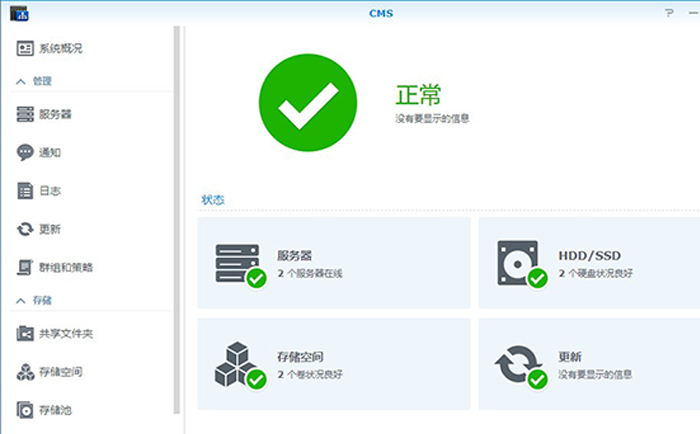 通過群暉 CMS,可以高效便捷的管理多臺群暉NAS服務(wù)器,即使足不出戶也可以在一個管理界面上管理多臺NAS,一目了然的監(jiān)控所有的NAS服務(wù)器的狀態(tài)。解決設(shè)備過多維護人員難以監(jiān)控的窘迫。