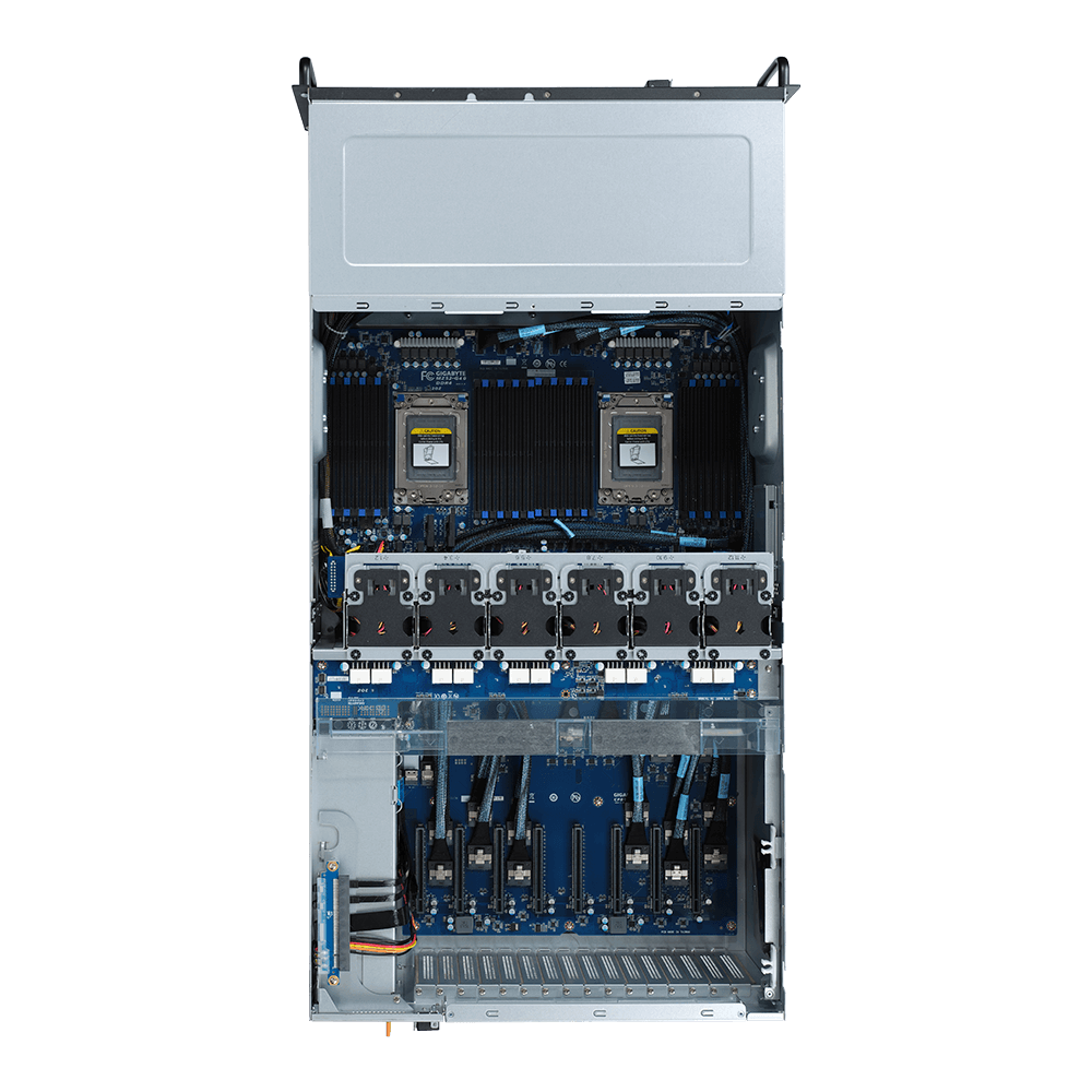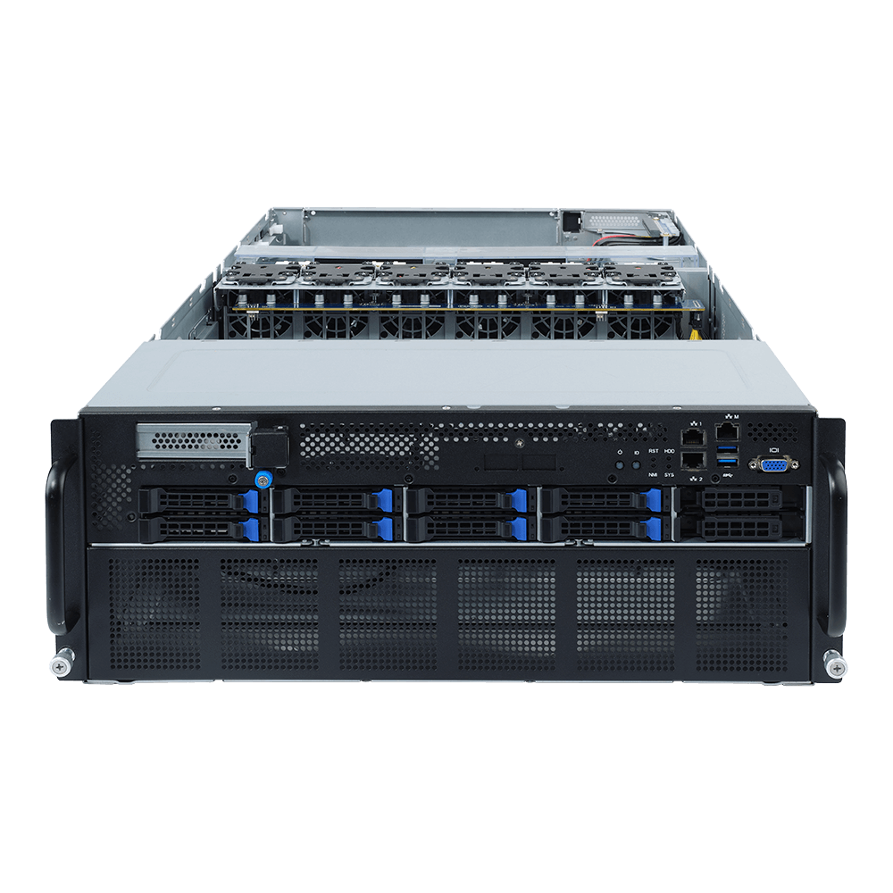 The G482-Z52 is one of the world’s first PCIe Gen 4.0 GPU server systems to be released to the market, featuring support for up to eight dual-width PCIe Gen 4.0 GPU cards (with each GPU connected directly to the processor via PCIe root). It is ideal to integrate an “AMD on AMD” solution using 2nd Gen EPYC processors together with the Radeon Instinct MI50, the world’s first 7nm, PCIe Gen 4.0 data center GPU, or with other Gen 3.0 or Gen 4.0 GPU cards for applications such as deep learning, cloud gaming or video streaming.