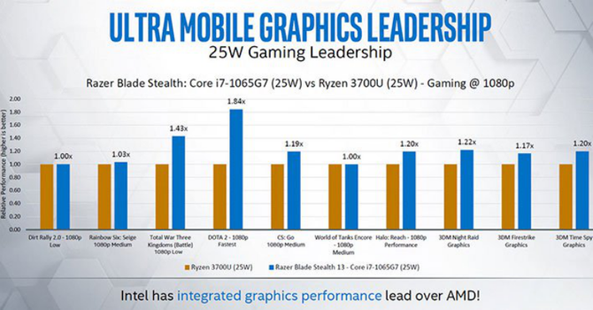當(dāng)然,最有意思的,應(yīng)該還是和AMD的處理器做比。眾所周知,AMD移動(dòng)版處理器內(nèi)置的Vega核顯是擁有入門獨(dú)顯級別性能的,比此前英特爾的Gen 9核顯要強(qiáng)出不少,但是隨著Gen 11核顯的到來,情況似乎發(fā)生了逆轉(zhuǎn),根據(jù)官方給出的數(shù)據(jù)顯示,在1080P分辨率下,i7-1065G7(25W)在很多測試的游戲中都超越了采用Vega 10核顯的Ryzen 7 3700U(TDP同樣是25W),在《Dota 2》游戲中甚至有1.84倍的性能領(lǐng)先,最不濟(jì)也能保證持平。