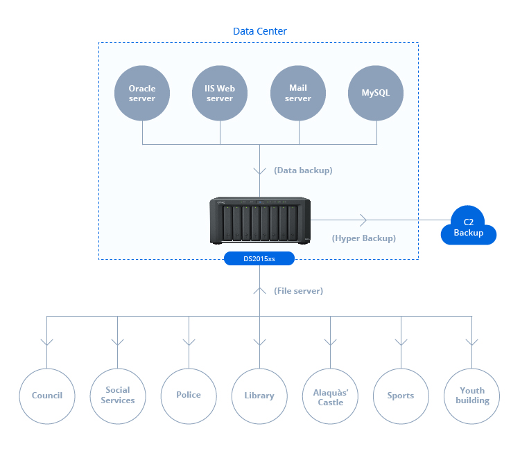 該市起初使用一臺 Synology DS2015xs 作為文件服務(wù)器來保存和共享來自不同部門的數(shù)據(jù)。