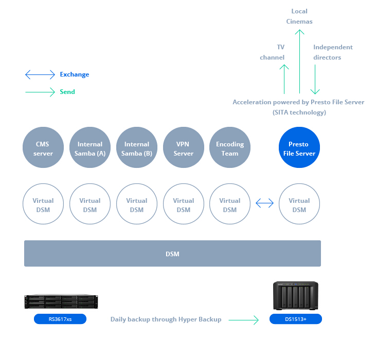 Presto File Server 提供的穩(wěn)定高速傳輸功能滿足我們的需求,它已經(jīng)取代了我們以前的傳輸工具。憑借其在 VDSM 部署和 Btrfs 文件系統(tǒng)支持方面的靈活性,現(xiàn)在我們能夠以高效存儲(chǔ)的方式將所有服務(wù)整合到一臺(tái)服務(wù)器中?;蛟S可以說,這是真正的一體化解決方案。