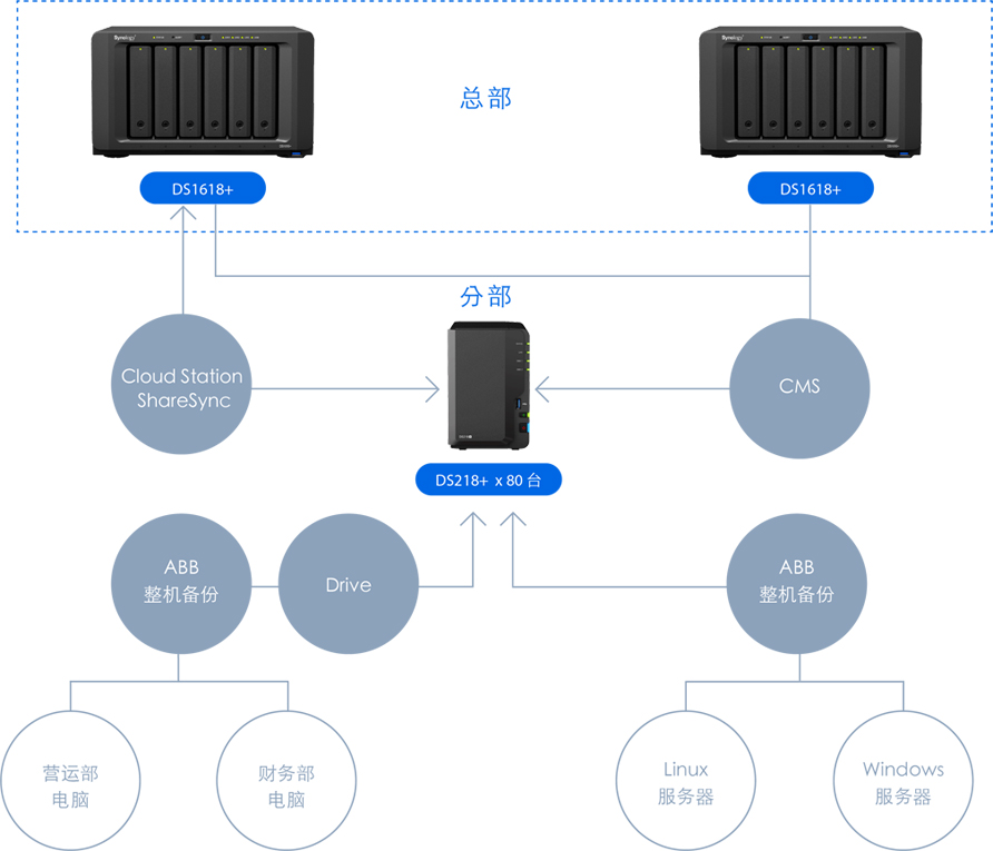 針對(duì)門店?duì)I運(yùn)部、財(cái)務(wù)部電腦里的重要文件,我們?yōu)殡娔X設(shè)置賬戶并進(jìn)行備份。先用 Drive 將辦公文件備份到分部的 NAS 上,然后再通過(guò) Cloud Station ShareSync ?將文件統(tǒng)一同步并歸檔到總部的 DS1618+ 上。想要管理眾多分部的 80 臺(tái) DS218+ 也很方便,我們可以在總部的 DS1618+ 上統(tǒng)一配置、監(jiān)控所有分部的數(shù)據(jù),并選擇性同步下發(fā)各項(xiàng)公文、通知。