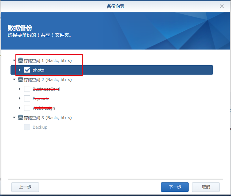 4、下一步,數(shù)據(jù)備份,選擇要備份的共享文件夾。勾選photo文件夾(即硬盤(pán)1中需要備份的文件),即將硬盤(pán)1中的photo文件備份至硬盤(pán)2中。
