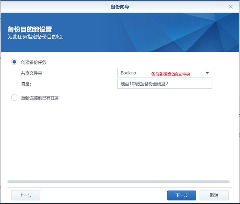 3、下一步,備份目的設(shè)置,為此任務(wù)指定備份目的地。選擇要備份的目標(biāo)文件夾,以及設(shè)置好目錄名。