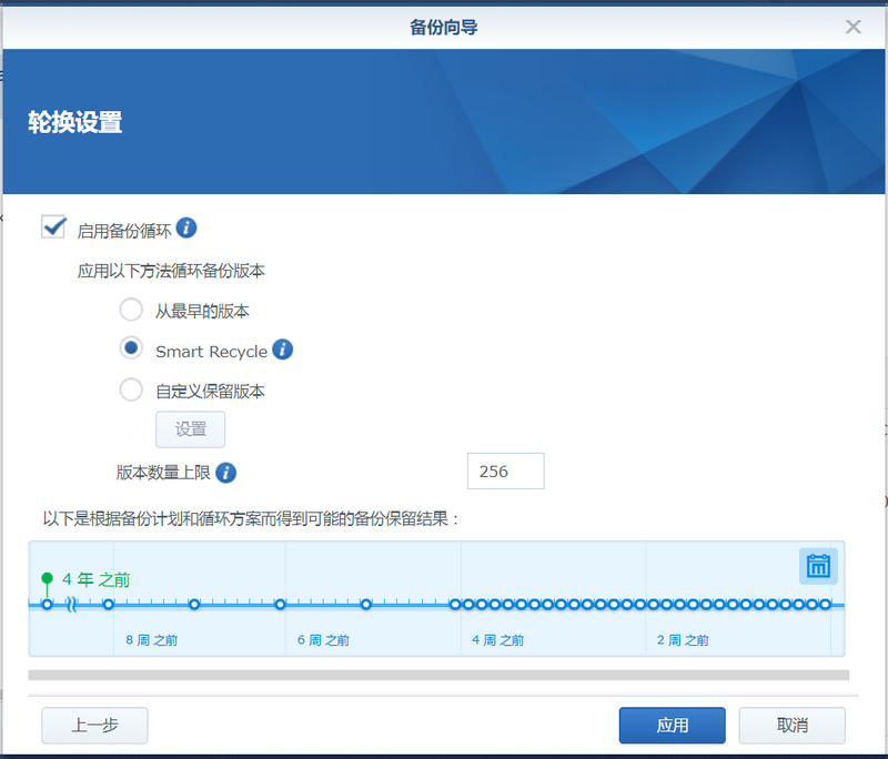 6、輪換設(shè)置,可以啟用備份循環(huán)或者不啟用。啟用后會(huì)保存一定數(shù)據(jù)的版本,如圖設(shè)置為256個(gè)版本,但同時(shí)也會(huì)增加備份文件占用空間。