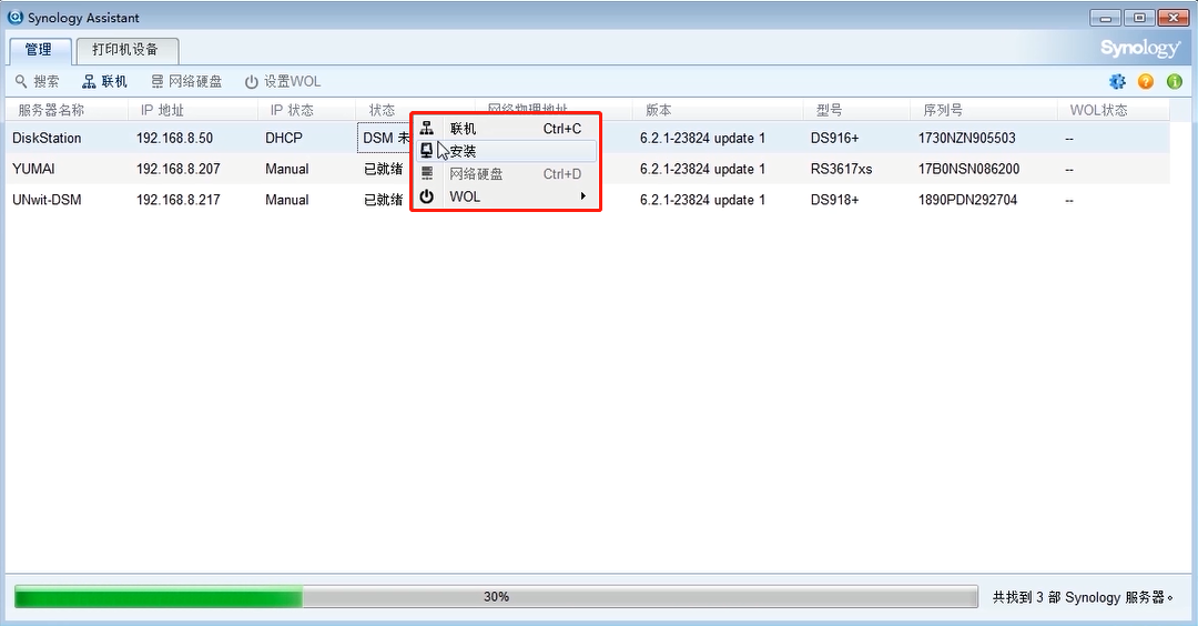 找到之后右鍵那個DSM未安裝的機(jī)器選擇安裝。