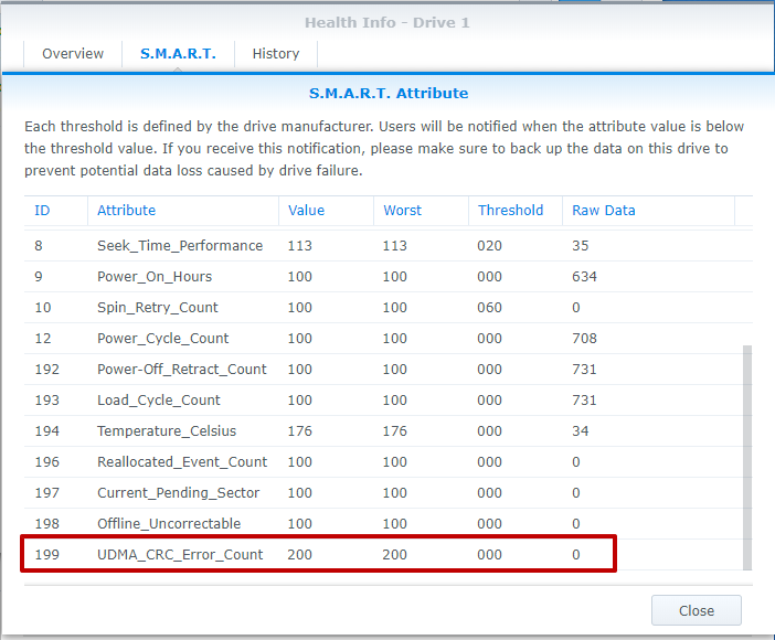 3、檢查硬盤的屬性 ID 199。如果原始數(shù)據(jù)增加,或者如果系統(tǒng)無法識(shí)別硬盤,則很可能發(fā)生故障。如果更換硬盤的原始數(shù)據(jù)增加,而可疑故障硬盤的原始數(shù)據(jù)保持為零,則問題與 Synology NAS 有關(guān)。如果在插入上一個(gè)插槽時(shí)無法識(shí)別更換硬盤,則插槽可能發(fā)生故障。
